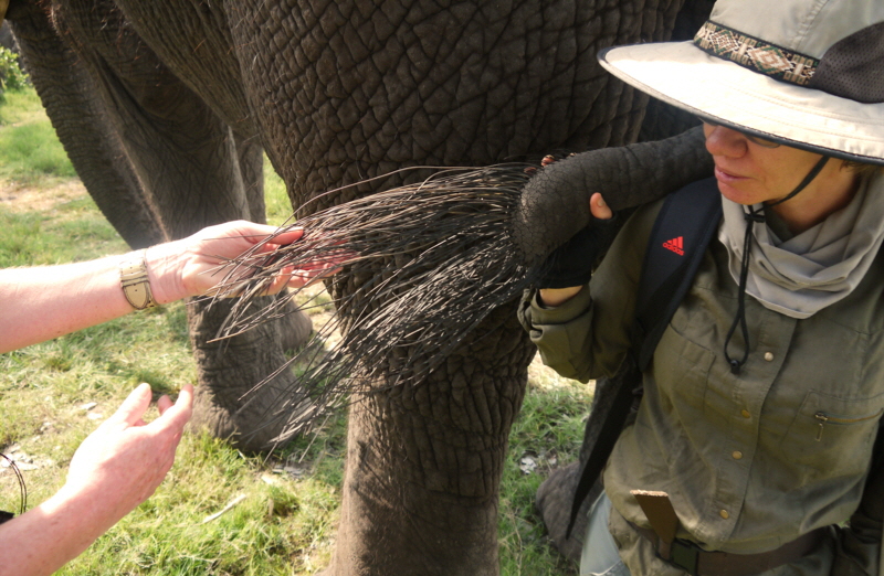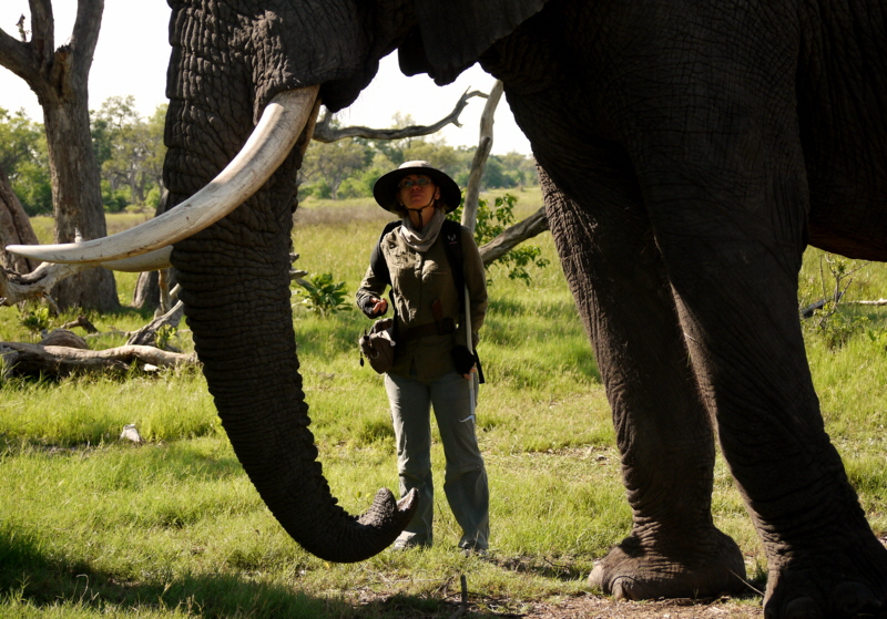 Tag 6 und 7: Stanleys und Baines: Safari-Camp mit Elefantenwanderung: Schon wurden wir am 6.12. wieder zum Airstrip gefahren, wo es mit einer viersitzigen Maschine weiterging zu den beiden Sanctuary Camps Stanleys und Baines im Okavango Delta. Ich durfte wegen der gleichmäßigen Gewichtsverteilu ng vorne neben Andreas, dem netten Piloten sitzen, und habe schön Hände und Füße eingezogen, um weder an die Steuerung noch an die Pedale zu kommen. Wir waren an unserem nächsten Ziel besonders auf das „Walking with Elephants“ gespannt, bei dem wir Doug und Sandi mit Jabu, Thembi und Marula kennenlernen würden, die mit diesen drei Elefanten schon seit 27 Jahren zusammenleben. Willem, der weiße südafrikanische Manager, begrüßte uns bei Stanleys mitsamt einem singenden Chor der Campangestellten, den üblichen kalten Tüchern und einem Willkommensgetränk. Die Frauen hatten Spaß und sangen gleich noch ein zweites Lied. Da es Mittagszeit war, hatte man mit dem Essen auf uns gewartet, das in drei Gängen am weiß gedeckten Tisch im beeindruckend gestylten weißen Speisezelt serviert wurde. Wow, das hatten wir so im Busch noch nicht gesehen. Nach dem exzellenten Mahl wurde uns darüber hinaus noch ein Espresso aus der Jura-Kaffeemaschine angeboten, da waren wir vollends glücklich. Auch das Zelt war nett, aber ähnlich wie in Kwara nicht ganz so groß und mit nur einem Waschtisch, so dass wir Frauen nicht alles herumliegen lassen konnten. Unser Zimmermädchen erklärte uns alles bis hin zum bereitliegenden Insektenspray und den allgegenwärtigen Alarmhupen, und freute sich sichtlich, dass wir die zu Elefanten auf dem Bett drapierten Handtücher lobten. Den vorhandenen Swimmingpool nutzten wir wie schon die Tage zuvor nicht. Schon wieder gab es etwas zu essen, sehr leckere Gemüsepizza, eine köstliche Torte, Scones mit Marmelade sowie Kekse und Obst zur Teatime – unweigerlich würden wir auf dieser Safari zunehmen, wenn das so weiterging, denn schließlich mussten wir testen, was dort angeboten wurde! Willem empfahl uns, doch heute einmal eine Mokoro-Fahrt zu machen, die wir wegen der spannenden Tierwelt an Land bisher abgelehnt hatten. Mir hat es sehr gut gefallen, weil es eine unglaubliche Stille und wunderschöne Fotomotive auf dem Wasser gab, Sylvia hatte nach dem einem Mal genug, weil es nicht genügend Action gab. Geschmackssache! Es gab jedenfalls einen schönen Sundowner mi t einem deutschen Pärchen und ihrem Reisebericht von der Safari auf einer kleinen Insel, die wegen der vielen Erdlöcher zu Gesprächen über die Möglichkeit einer Sichtung der geheimnisvollen Aardvarks, Erdwolfs Anlass bot. Man versicherte uns jedoch, diese seien „very nocturnal animals“ und ganz schwer zu beobachten, schade! Peter hat uns wunderbar und ohne nasse Füße mit dem Mokoro wieder ans Land gebracht. Vor dem wiederum exzellenten Dinner konnte man sich mit einem Drink am Lagerfeuer niederlassen, zumal es heute wie am nächsten Tag nicht regnete, sondern ein ganz angenehmes Klima herrschte. Weil der Abend noch so schön war und wir nach ein paar Gläsern Wein wieder früh zum Zelt gebracht wurden, wollten wir noch ein bisschen draußen sitzen und ich eine Abendzigarette rauchen. Aber wie das so ist beim Blick in völlige Dunkelheit, plötzlich meint man einen Umriss zu sehen, der vorher nicht da war. Nachdem ich davon überzeugt war, hinter dem Busch säße ein Löwe, auch wenn Sylvia sich kaputtgelacht hat und mit der Taschenlampe keine reflektierenden Katzenaugen feststellen konnte, flüchtete ich ins Safari-Zelt. Des Rätsels Lösung war am nächsten Morgen ein Stück totes Holz, aber man weiß ja nie …! Nun ging es zur persönlichen Elefantenerfahrung, da lassen wir Bilder sprechen (siehe oben) und versichern, dass es einzigartig war und auf keinen Fall bei einer Safari im OKavango versäumt werden sollte! Schön, dass wir hier auch einmal ein Busch-Lunch hatten, wie wir es in Kenia oft erlebt haben. Der Guide von Stanleys, der uns beim Wandern mit den Elefanten gegen andere wilde Tiere nach hinten absichern sollte, war allerdings eine echte Pest. Nicht nur, dass er mit dem Gewehr unbeholfen herumfuchtelte oder auf sein Smartphone schaute, er versuchte uns auch die ganze Zeit, etwas über Bäume zu erzählen, während wir uns fasziniert auf die Elefanten konzentrierten. Gut, dass er uns nicht tatsächlich vor etwas schützen musste, denn er lief au ch gerne einmal zwischen uns und den Elefanten, anstatt sich im Hintergrund zu halten. Er war aber wirklich der Einzige, der uns negativ aufgefallen ist. Auch im Baines Camp gab es wieder sehr nette Sachen zur Teatime, und ein wunderschönes Zelt mit Himmelbett und Moskitonetz, das man auf die große Terrasse unter den Sternenhimmel hätte schieben können. Das Safari-Camp ist komplett auf Stelzen gebaut, man kann sich aber angesichts der grünen Umgebung und der Bäume kaum vorstellen, dass es zur anderen Jahreszeit von Wasser umgeben ist. Es hat einen ganz anderen Stil als Stanleys, aber ebenfalls einen netten Manager (Kevin), guten Service sowie Pflegeprodukte von africology und einen Föhn (Seltenheit, weil meist nicht genügend Strom vorhanden). Hier haben wir endlich einmal den Pool genutzt, der auch über zwei schattige offene Pavillons und einen Kühlschrank verfügte. Angenehm! Die abendliche Safari im Okavango bescherte uns viele Gnus und Tsessebe-Antilopen mit Jungen, Warzenschweine, Zebras, Impalas, Paviane und eine Leopardin auf der Jagd! Eine weitere Überraschung folgte jedoch, als wir nach der Rückkehr kurz zum Umziehen ins Zelt wollten. Terrasse und Zimmer waren mit Petroleumlaternen beleuchet, eine Karaffe Sherry stand bereit, und draußen war weißer Schaum zu sehen, wo vorher nichts stand. Das Öffnen der Terrassentür brachte das Wunder zum Vorschein: Zwei Zuber mit heißem Schaumbad, weiße Frotteevorleger und Handtücher sowie Schlappen und Bademäntel lagen im Kerzenlicht bereicht, wirklich sensationell! Perfekt für