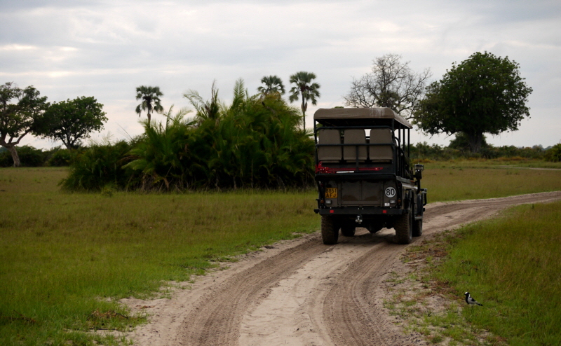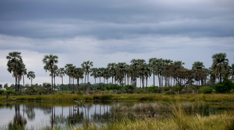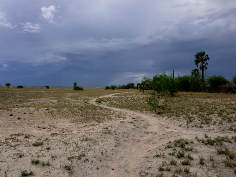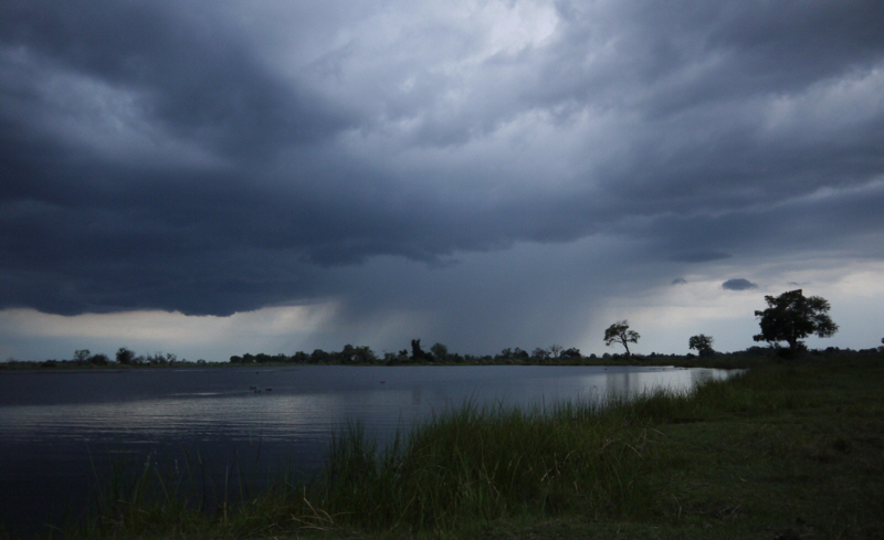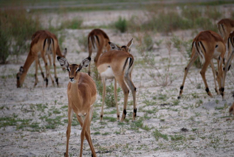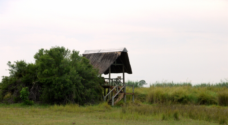 Tag 8: Kwetsani Camp, Jao Concession: Das von Wilderness Safaris betriebene Kwetsani Camp ist ebenfalls auf Stelzen gebaut und liegt während der Flutperiode am Wasser. Wir schauten dagegen auf grüne Ebenen und hatten ein bisschen Wasser von oben, es war auch nicht besonders wa rm, so dass Dan, der Camp-Manager aus Zimbabwe, uns mit fleece-gefütterten Capes im Auto versorgte. Er kündigte an, dass eine Löwin mit Jungen ganz in der Nähe unter einem dichten Palmenversteck lagern würde, die nachmittags, wenn es nicht mehr regnete, sicherlich herauskäme. Der Empfang durch seine Frau Charmaine war sehr herzlich, und das Kwetsani Camp wunderschön. Auch hier hatte man uns Essen verwahrt, das später von einer köstlichen Teatime gefolgt wurde. Die bereitstehenden Schirme mussten wir nutzen, auch um die nassen Sachen aus der Tasche einem Hausmädchen zum Versuch des Trocknens/Bügelns zu übergeben. Direkt am Camp gab es Paviane, Meerkatzen und Mungos, die wir beobachten konnten. Die Verhaltensregel, auf den Stegen nicht weiterzugehen, falls daneben mal ein Elefant stehen sollte, haben wir dagegen nicht gebraucht. Außer uns waren noch ein belgisches und ein französisches Paar dort, was sich sowohl auf der nachmittäglichen Suche nach den Löwen als auch beim Abendessen als sehr witzig herausstellte. Selten haben wir so viel gelacht und getrunken, was aber auch an der familiären Betreuung durch die tollen Gastgeber lag. Unser guter Guide hat zwar in der Ferne zwei Löwinnen auf der Jagd beobachtet, sich aber leider im Sumpf festgefahren, danach waren sie weg. Die Löwinnen mit den Jungen wollten ihr Versteck immer noch nicht verlassen, es sollte wohl nicht sein. Katzen im Regen klappt nicht so gut, dafür war ganz Botswana dankbar dafür, ebenso die vielen Antilopen, die nun alle ihre Jungen zur Welt bringen und fröhlich herumspringen.