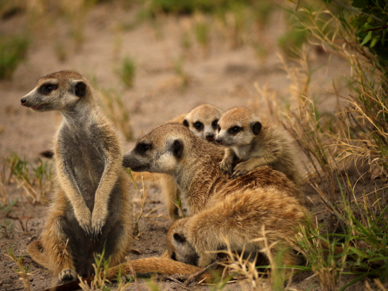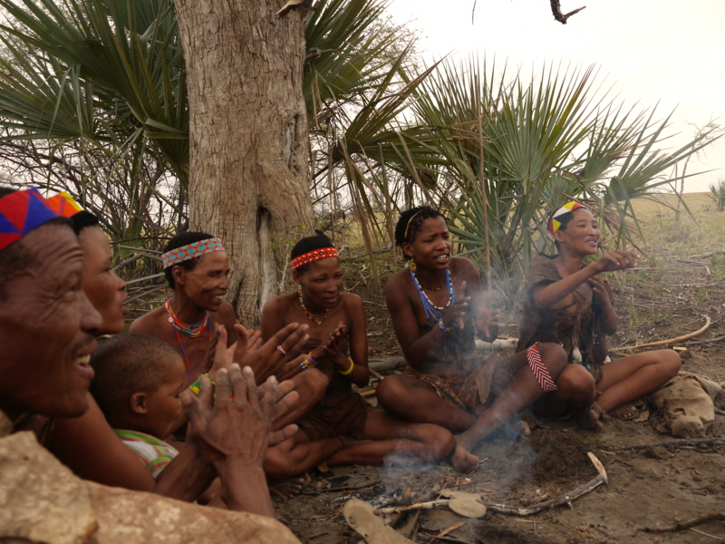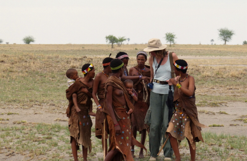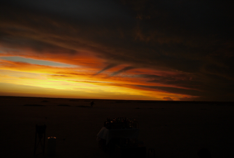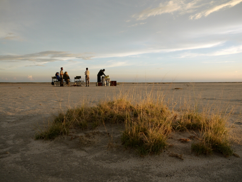 Wir fuhren am nächsten Morgen in den Makgadikgadi-Pans und Nxai-Pans National Park, um nach Tieren Ausschau zu halten, die Regencapes waren heute wieder unsere Begleiter. Nie hätten wir gedacht, dass wir das meiste Wasser im botswanischen Sommer ausgerechnet in der Wüste sehen … Und da standen sie am Horizont, die ersten Zebraherden, und es wurden immer mehr. Wir waren begeistert, besonders Paola, die bisher auf ihrer Safari keine gesehen hatte. Die Nationalparkranger durften uns nicht beim Aussteigen erwischen, sie sind streng, weil die dünne Grasnarbe dieses Schutzgebietes sehr empfindlich ist und nicht befahren oder betreten werden darf. Aber Super hatte noch ein Highlight für uns, wir fuhren am Nachmittag zu den Erdmännchen (Meerkats), die sich immer irgendwo in der Nähe aufhalten und an Menschen gewöhnt sind. Sylvia und ich konnten auch nach einer Stunde nicht genug bekommen von diesen niedlichen Tieren mit ihren gurrenden Lauten, auch hier waren Kleine Erdmännchen dabei, und man konnte sie toll beobachten. Während ich auf dem Boden mittendrin lag, wußte Paola nicht so recht, was sie davon halten soll, sie waren schon fertig mit gucken ( Anm.: und fragten ob es die auch in Größer gäbe..), auch unser Guide Super wunderte sich. Er wollte aber noch vor Einbruch der Dunkelheit zu den seltenen Braunen Hyänen, auch da sagten wir nicht nein. Am nächsten Morgen stand die Wanderung mit den San-Buschmännern, oder besser San Buschleuten auf dem Programm. Eine junge San-Frau und ein älterer Mann sprechen gut englisch und übersetzten uns, was die anderen mit ihren erstaunlichen Klicklauten über die Pflanzen und Tiere der Umgebung erklärten. Wir sahen ihre traditionelle Kleidung und wie sie Feuer machten, aber auch, welche Spiele sie spielen und wie sie Skorpione fangen, nur zum Zeitvertreib. Es wurde ausgelassen gelacht, insbesondere, als sie auf Lucas oder Sylvias Kamera schauen durften, welche Fotos von ihnen gemacht wurden. Gut kam aber auch an, als ich mir als Gesellschaft zu ihrem Pfeifchen am Feuer eine Zigarette anmachte, sie wollten sie haben und reichten sie unter tiefen Zügen von Hand zu Hand weiter, bis sie blitzschnell weg war. Schmeckte scheinbar besser als das Kraut, was sie selbst rauchen. In den Safari-Camps geht das selbstverständlich nur außerhalb der Räume, um die anderen Gäste nicht zu stören. Die Sonne kam raus, und wir freuten uns, schnell wurde es richtig warm und die kurzen Sachen kamen doch zum Einsatz. Ein langer Nachmittag am wunderschönen Pool von Jacks Camp mit einem Buch bot sich an, ich las gerade passend „Cry of the Kalahari“ und fühlte mich der Welt entrückt. Sundowner gab es in Jack’s Camp üblicherweise nicht, aber bei Rückkehr einen Aperitiv aus der umfangreichen Bar und einen Gruß aus der Küche. Verena und Super leisteten uns immer Gesellschaft und wir unterhielten uns gut, es war eine interessante Runde. Am Nachmittag wollte Sylvia unbedingt noch mal zu den Erdmännchen, sie hatte auch in unserem Safari-Zelt ein tolles Buch über deren Lebensweise entdeckt. Super grinste und sagte „I don’t want to give you too much of the Meerkats“, ließ sich aber erweichen und fuhr noch einmal kurz bei unseren erklärten Lieblingstieren vorbei. Luca und Paola blieben im Auto, wir hockten auf dem Boden. Dann ging es aber weiter Richtung „The Big Nothing“, zu unseren Pans, die mich schon am ersten Abend fasziniert hatten. Und wir sahen die Zebras, sie waren tatsächlich auf dem Weg! Sie wurden von einem unglaublich dramatischen Abendlicht angestrahlt, sogar einen Regenbogen ohne Regen gab es. Als wir schon dachten schöner geht es nicht mehr, stoppte Super das Auto in der Salzpfanne und dort stand mitten im Nichts im Gegenlicht ein Tisch mit weißer Decke und der kompletten Bar. Es gab Stühle und ein Lagerfeuer, ganz großes Kino für Ästheten und Romantiker gleichermaßen, als der Sonnenuntergang den Himmel und die Wolken alle paar Sekunden umfärbte. Ich bin diesem Ort rettungslos verfallen, auch Sylvia war jetzt beeindruckt. Super schlug vor, dass sich jeder einen Stuhl und sein Glas mitnimmt, und ein Stück weit von allen weg geht, um die Stille zu hören. Ich machte das als einzige, denn der Akku meiner Kamera hatte sich mit den letzten Zebras verabschiedet. Alle gingen irgendwo herum und fotografierten das Schauspiel, ich hatte frei und schaute nur den Himmel und die Weite an, welch unglaublicher Luxus. Wird schon einer ein Erinnerungsbild für mich gemacht haben … (danke, Sylvia) Der Vollständigkeit halber muss ich hier noch weiterschreiben, es gab am nächsten Morgen noch den auf tausend Jahre geschätzten riesigen Chapman’s Baobab zu sehen, und ein paar Strauße und andere Vögel. Angesehen haben wir uns auch das Camp Kalahari, die dortigen Zelte sind sehr schön und viel heller, der Loungebereich ist einfacher, aber ausreichend. Wer nicht das “Besondere Etwas” sucht, ist hier richtig, die Safari Aktivitäten sind die selben, bei einem günstigerem Preis.