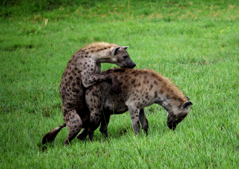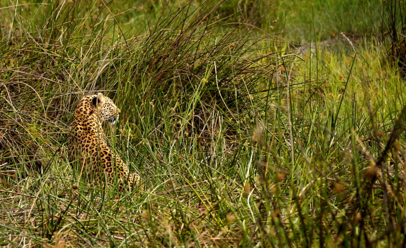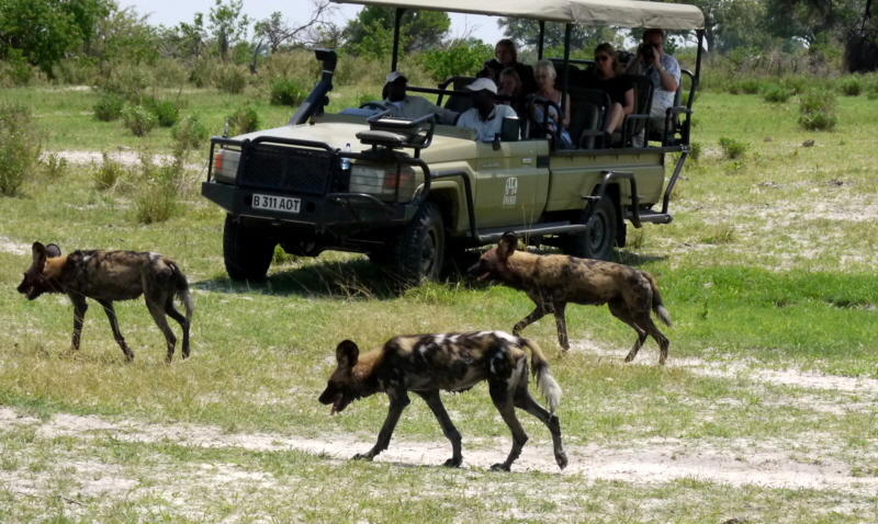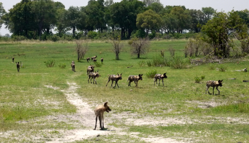 Tag 3: Little Kwara: Der Gamedrive am nächsten Morgen bescherte uns schon wieder pralles Tierleben auf der grünen Wiese: Ein Rudel von sechs zutraulichen Tüpfelhyänen nahm unser Safari-Fahrzeug näher in Augenschein, eine schnüffelte sogar am Reifen. Ein Pärchen widmete sich unbeirrt der Fortpflanzung, während eine trächtige Hyäne sich hinsetzte und uns ihren dicken Bauch zeigte. Erstaunlicherweise stieg der Tracker nicht von seinem vorderen Aussichtssitz, wie das wohl in Botswana bei der Annäherung an Raubtiere Vorschrift ist, gestern bei den Wildhunden war er aber ganz schnell im Fahrzeug. Auf unserer Fahrt bekamen wir auch noch ganz nah einen einsamen Geparden zu sehen, er rief nach seinem Bruder, der auf Brautschau war. Unsere Fahrt ging anschließend zum nur fünf Minuten entfernten Safari-Camp Little Kwara, na, da hätten wir ja kaum wechseln brauchen. Es ist etwas kleiner und exklusiver, und die Zelte sind größer und haben einen schönen Doppelwaschtisch mit genügend Licht auch für die Damen. Die junge botswanische Managerin, das Essen und der Service waren ähnlich wie in Kwara zwar bemüht, aber nicht hochklassig.