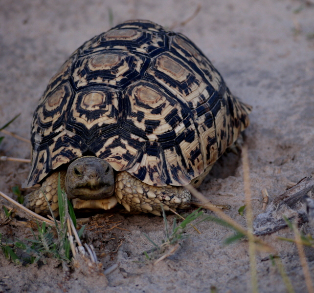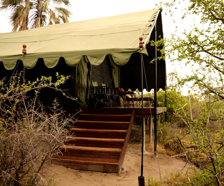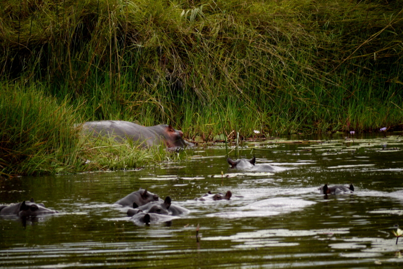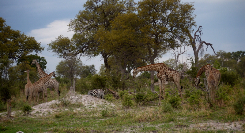 Tag 5: Lebala: Eine besonders nette Atmosphäre bot das Kwando Lebala Camp, das wir nicht nur wegen des malerischen Eingangs mit Steg über einen Seerosenteich inklusive Haushippo gleich in unser Herz schlossen: Der dortige botswanische Manager Charles verstand sein Geschäft, und bot mit seinen Angestellten herzlichen persönlichen Service und gute Unterhaltung, auch das Dekor und das luxuriöse riesige Zelt war sehr ansprechend. Hier gab es zur Teatime nicht nur Wraps mit Fleisch und mit Gemüse, sondern auch einen Kuchen und Wassermelonenstücke. Das lässt das Brunch gut verschmerzen. Getränke sind in der heißen Jahreszeit überall nicht nur Tee und Kaffee (hier neben löslichem auch richtig gebrühten), sondern Krüge mit dem beliebten Roibusch-Eistee und selbstgemachte Limonade. Unsere engagierten Guides waren Bali und Mr. Mo, der als Tracker eine große Strecke durch Buschland zu Fuß ging, um zwei männliche Löwen für uns zu finden, die frische Spuren hinterlassen hatten. Wir auf unserem Gamedrive exklusiv zu zweit waren froh, dass er ihnen nicht wirklich zu Fuß begegnet ist, sondern sie später schlafend mit allen Vieren in der Luft bei der späten Siesta gefunden hat. Über Funk wurde auch das zweite Fahrzeug von Lebala gerufen, die Gäste hatten aber nicht so viel Geduld wie wir und fuhren bald weiter. Dann endlich gähnte einer der Löwen und räkelte sich schläfrig. Er stand aber nicht etwa auf, um nun erwartungsgemäß auf die Jagd zu gehen, sonder schritt nur ein paar Meter weiter, um ein großes Geschäft zu erledigen und dann an seinen Schlafplatz zurückzukehren! Ansonsten haben wir hier auf Safari sehr viele Elefanten gesehen, die anscheinend keine schlechten Erfahrungen kennen und unserem sich nähernden Auto freundlich interessiert begegneten, selbst wenn sie Junge dabei hatten. Sehr schön anzusehen waren auch die zahlreichen Giraffen in Gemeinschaft mit Zebras, die Vögel an den Wasserlöchern und nicht zu vergessen die Hippos, die zu einer Safari in Botswana unbedingt dazu gehören.