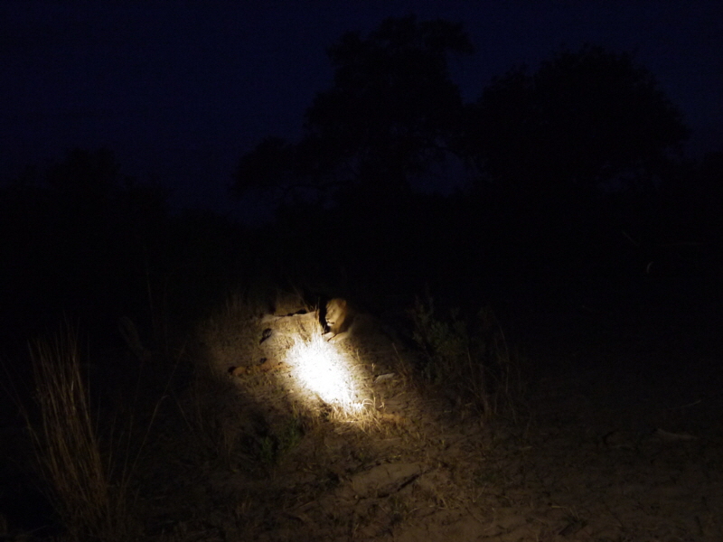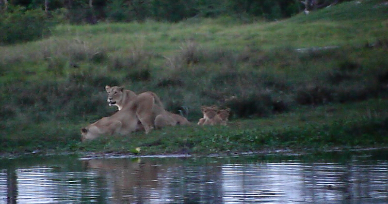 Tag 4: Lagoon: Das sollten wir auch im Kwando Lagoon so empfinden, das dafür aber Zelte von der Größe von Einfamilienhäusern hatte und bis auf die rutschigen Planken sehr schön war. Nach unserer Fluganreise ins Linyanti-Gebiet nahe des namibischen Caprivi-Streifens konnten wir dort von der Terrasse und aus unserer Außendusche eine Herde Elefanten beobachten, die zum Trinken und Plantschen an die Lagune kam! Neben einer zusätzlichen Innendusche und einer separaten Toilette mit Tür gab es eine freistehende Badewanne ebenfalls mit Ausblick, das kommt im Winter sicher gelegen, wenn es abends kalt wird. Zum Sundowner hatte sich die Küche etwas einfallen lassen und den Guides drei Arten von selbstgemachtem herzhaften Gebäck mitgegeben. Als spektakulär erwies sich jedoch die Kulisse: Zwei Stunden hatten wir vergeblich nach Löwinnen mit Jungen gesucht, die irgendwo in der Nähe sein mussten. Als wir dann genug durchgeschüttelt waren und nach einer Sundowner-Pause riefen, fuhren uns die Guides zu einem schönen Hippo-Pond, wo wir zufrieden mit unseren Gin-Tonic auf die Abendlandschaft schauten. Aus dem Augenwinkel heraus bemerkte dann Sylvia, dass sich auf der anderen Seite des kleinen Teiches drei Löwinnen und fünf Junge im Gänsemarsch näherten und ganz entspannt ans Wasser zum trinken kamen! Schnell waren Tischchen und Getränkebox verstaut und wir fuhren ein wenig näher. Die Kleinen schauten mit großen Augen und trauten sich nicht am Auto vorbei, das kannten sie noch nicht. Die Mütter machten es jedoch vor und hatten gar kein Problem mit unserer Gesellschaft. Weil es schon fast dunkel war, kamen die meisten Kameras mit den beweglichen Motiven nicht mehr ganz so gut klar … aber wunderschön und aufregend war es! Partner, der uns dort führte, arbeitet eigentlich in Lebala Camp. Die Kwando-Camps machen immer auf dem Rückweg eine „Nachtfahrt“ mit Scheinwerfer, leuchten aber nur die nachtaktiven Tiere an, nicht die Antilopen. Es ist Glückssache, dabei etwas zu entdecken. Eine Katze fanden wir nie, (Anm: doch Petra, den Löwen hast Du vergessen..) aber einmal kreuzte tatsächlich ein erstaunlich großes Stachelschwein den Weg und schaute uns mit seinem rosa Gesicht empört an. Es ist in Botswana auf Safari anscheinend nicht üblich, sich nach dem Abendessen noch lange an der Bar aufzuhalten. Wegen des in der Regenzeit öfters einsetzenden abendlichen Regens wurden auch die Bomas mit Lagerfeuer nicht genutzt. Die Guides und der Manager essen mit den safari-Gästen, möchten diese aber anschließend mit Taschenlampe (und ggf. Schirm) zu ihren Zelten geleiten. Abends noch lesen ist nicht, besser macht man das Licht aus, um keine Käfer und Motten anzuziehen, die nachts umherschwirren und einen auch beim Abendessen um Laternen und Gläser schwirren. Na ja, um 5:30 Uhr wird man ja auch schon wieder geweckt, bei Kwando gibt es dazu leider kein Kaffeetablett, sondern nur ein schnelles Frühstück im Speisebereich.