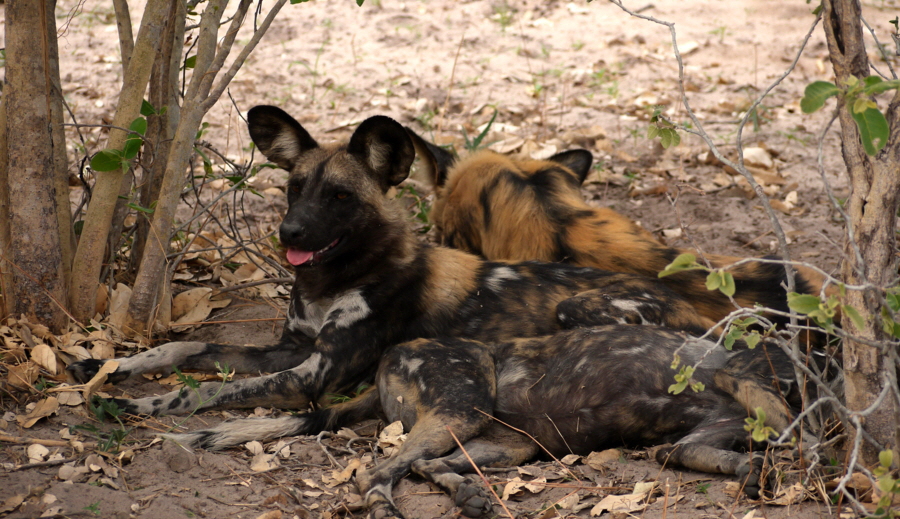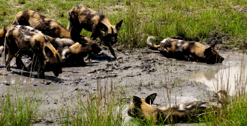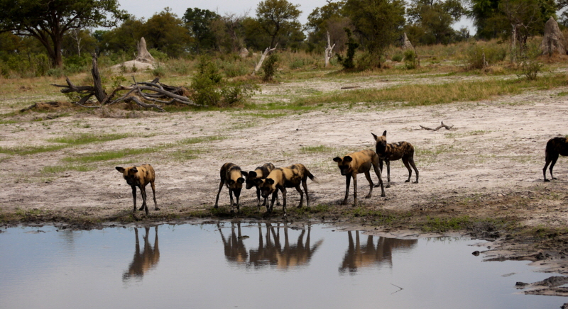 Tag 2 : Flug-Safari ins Okavango Delta , Kwando Concession, Kwara Camp Die für Afrika typischen Vogelstimmen und die Vorfreude auf die Safari weckten uns früh am kommenden Morgen, so dass wir Zeit hatten, ausgiebig und mit gutem Wasserdruck warm zu duschen und Marijes Frühstücksbuffet zu kosten. Sicherlich ist das Preis-/ Leistungsverhältnis hier für Maun unschlagbar. Der bisher laut Marije immer zuverlässige Taxifahrer kam allerdings zu spät („er scheint nach einem Jahr seine Halbwertzeit überschritten zu haben“ meinte sie), so dass wir den Weg zum Flughafen bei mittlerweile Regen etwas flotter zurücklegen mussten. Immer schön auf die zahlreich an der Straße stehenden Esel in „Donkeytown“ achten! Außer den in der Landschaft verstreuten nicht gerade malerischen unverputzten Steinhütten und Gerümpel haben wir von einem Ort nicht viel entdecken können. Lediglich direkt am Flughafen gibt es ein paar kleine Shops, Cafés und die Büros der Safari-Companys. Wer in den Flughafen kommt, wird gleich angesprochen, wo er denn hin möchte, und völlig ohne Ticket nach einem Blick auf die Namensliste und kurze Kontrolle des Gepäcks aufs Rollfeld geleitet. Ach, daher braucht man hier keine Reiseunterlagen, sehr ungewohnt, klappt aber hervorragend, wie wir auch im weiteren Verlauf der Safari in Botswana immer wieder feststellen konnten. Als Sylvia den der jungen Piloten der 12-sitzigen Cessna Caravan sah, fragte sie mich gleich, ob der denn wohl schon den Flugschein habe …? Es kam aber noch schlimmer für sie: Während des Fluges schüttete sich unser einziger(!) Pilot fröhlich Nüsschen aus einer Tüte in den zurückgelegten Hals, und Sylvia dachte, sie müsste gleich erste Hilfe leisten, falls er einen Erstickungsanfall bekommt. Er ist jedoch sicher in der Kwando Konzession im Moremi-Gebiet gelandet, dafür war Sylvia nach der letzten Schrägschleife zum Airstrip schlecht. Da hilft nur, immer den Horizont im Auge zu behalten, anstatt auf die sich drehende Landschaft zu schauen. Endlich im Busch!! Wir wurden von einem Guide und einem Tracker des Kwara Camps abgeholt und sahen auf d em Weg dorthin (nachdem wir trotz der schon fast 11 Uhr energisch einen kleinen Gamedrive eingefordert hatte, schließlich hatten wir ja überall nur einen Tag Zeit) gleich ein Rudel von 18 Wildhunden, einige davon erst 6 Monate alt. Sie boten uns ein echtes Schauspiel, denn sie erhoben sich netterweise von ihrem Ruheplatz, tollten miteinander herum, und liefen zu einem Wasserloch, wo wir sie beim Wellnessprogramm im Schlamm beobachten konnten. Schon waren die ersten Videos im Kasten, besser konnte es ja kaum kommen. Die gut ausgebildeten Safari-Guides konnten uns erklären, wer die Alpha-Tiere des Rudels waren, und wie die sozialen Strukturen dieser seltenen und bedrohten Tiere funktionieren. Im Camp wurden wir anschließend von den beiden Managerinnen begrüßt, runde Botswana-Frauen, mal etwas anderes, das fanden wir gut. Es gab gleich „Brunch“ zu Mittag, das eher so etwas wie ein Full English Breakfast war, das man sich aus den Pfannen vom Buffet selbst nehmen musste. Ich entdeckte aber am anderen Ende des Tisches kurz vor dem Abräumen noch eine köstlich bestückte Käseplatte mit Crackern unter einer Insektenhaube. Solche Spezialitäten kommen hier wie der Wein aus Südafrika. So war es auch in den weiteren Kwando-Camps, die wir in den nächsten Tagen besuchten, allmählich verstanden wir das System. Was gut geklappt hat, war in jedem Camp die Nachfrage nach speziellen Diäterfordernissen, vegetarisch war kein Problem, aber auch Allergien wurden fleißig notiert. Alle Getränke konnte (und musste ) man sich selbst aus dem Kühlschrank holen. Kaffee und Tee wurde nur auf Anforderung nach dem Essen vom Kellner am Buffet zubereitet, und oh Schreck, mit löslichem Kaffee! Das sind wir als echte Kaffeetanten aus Kenia aber anders gewöhnt! Eine gute und nachhaltige Idee sind jedoch die Trinkflaschen, die jeder Gast zu Beginn des Aufenthalts bekommt, seinen Namen draufschreibt, und am gekühlten Wasserbehälter jederzeit für die Game Drives auffüllen kann (wenn er es nicht vergisst). Das spart die unzähligen Plastikwasserflaschen, die sonst verteilt und nachher entsorgt werden müssen. Kwara: Das Safari-Camp Kwara liegt wunderschön unter Marula- und Mopane-Bäumen an einem See, und wir konnten von der e rhöhten Terrasse unseres geschmackvoll und umfassend ausgestatteten Zeltes unsere ersten botswanischen Red Lechwe – Sumpfantilopen, zutrauliche Impalas, Hippos, Warzenschweine, Eichhörnchen und viele bunte Vögel beobachten. Einfach herrlich, nach einer Dusche die Haare draußen trocknen zu lassen und mit dem Fernglas und der Kamera Siesta zu halten. Man kommt gar nicht dazu, in den überall angebotenen Büchern und Bildbänden zu blättern, dafür ist das echte Leben draußen viel zu spannend! Red Lechwe gibt es in Ostafrika nicht, denn sie sind mit ihrem Körperbau und ihrer Hufstruktur speziell an das Leben im Delta angepasst und so in der Lage, auch in den im Winter unter Wasser stehenden Flutebenen zu überleben. Nett bei Kwando sind die Informationsmappen in den Zimmern, die auch für jeden eine Tierliste zum mitnehmen und ankreuzen bereithalten. Am Nachmittag fand unser Guide Tom (den kannte jeder in den anderen Camps, weil er so „big“ war) die Afrikanischen Wildhunde wieder, und wir folgten ihnen bei der Jagd. Diese führte durch eine Elefantenherde mit Jungen, die über die rennenden Hunde sehr aufgebracht war und ihrerseits Jagd auf die drei Safarifahrzeuge von Kwara machte. Nun aber nichts wie weg! Die Fahrzeuge sind gut und bequem, bieten aber ganz ohne Dach weder Schutz vor der gleißenden Sonne noch vor einzelnen Regenschauern. Für letztere gibt es lange Capes, die im Falle eines Falles verteilt werden. Abgesehen davon, dass man sie beim Fahrwind schön festhalten muss, fließt das Regenwasser manchmal auch dahin ab, wohin man es nicht haben möchte. Zum Glück tro
