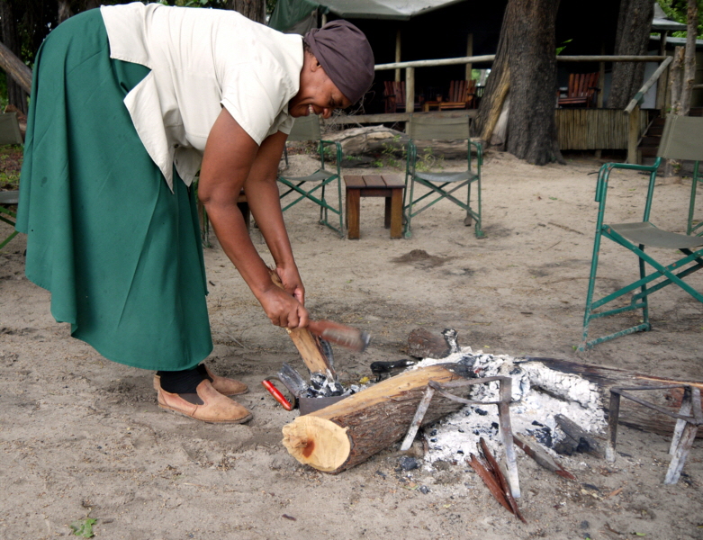 Tag 9 + 10 + 11: Jacks Camp, Makgadikgadi: Nach dem Rückflug nach Maun, alles nach wie vor ohne Tickets, die gibt einem erst der Pilot oder auch nicht, was dann egal ist, teilten wir das Kleinflugzeug zum Tsigaro Airstrip am Rande der Makgadikgadi-Pfannen mit einem italienischen Paar, Paola und Luca, einer Reisejournalistin und einem Fotografen, die ebenso wie wir drei Tage in Jack’s Camp verbringen wollten. Der kanadische Pilot war vom Flying Mission Service und flog uns sicher die weitere Strecke von einer Stunde durch die dichten Regenwolken, die sich aber über Makgadikgadi lichteten. Das Camp ist nicht weit entfernt und wirklich besonders in seiner Ausstattung, wie ein opulentes Beduinenzelt unter Palmen mit Möbeln aus den vierziger Jahren und vielen Tierexponaten und alten Fotos. Zum sich zu Hause fühlen trug bei, dass wir an diesem abgeschiedenen Ort unerwartet auch deutsch sprechen konnten, die junge Managerin Verena stammt aus Deutschland, ihr Mann Devon aus Zimbabwe. Nach einem stilvollen und köstlichen Essen bekamen wir das Camp erklärt, und es gab so viel zu schauen und zu fotografieren, dass die Zeit schnell verging. Hmm, Schokoladenbrownies mit Walnüssen und mit Ziegenfrischkäse gefüllte frische Mini-Windbeutel zum Tee, ich genoß es! Sylvia hatte leider, wohl vom zu vielen Fruchtsaft beim Frühstück, den einzigen Durchfall auf der ganzen Reise, und die Italiener wollten sich ausruhen, so dass ich alleine mit unserem Guide Super (er heißt so und ist so) Richtung Salzpfannen aufbrechen durfte. Er erklärte manches über das besondere Ökosystem und zeigte mir einen Kampfadler und junge braune Hyänen, aber letztlich bedurfte es nicht vieler Worte, die absolute Stille und Leere der Landschaft auf sich wirken zu lassen. In die Salzpfanne konnten wir wegen des nassen Bodens nicht weit hineinfahren, aber er ließ mich aussteigen und machte Fotos von mir vor diesem weiten Horizont, der zu meinen liebsten Reiseerinnerungen gehört. Super kündigte mir an, dass sich die Landschaft mit der nun begonnenen Regenzeit täglich verändern würde, und dass die Zebra-Migration bald da sein müsste. Wie sich herausstellte, hatte er damit Recht, so wie er seine Wüste mit ihren Tieren liebt, in der er seit 23 Jahren für Jack’s Camp arbeitet, das er mit aufgebaut hat. Er interessierte sich aber auch sehr für Kameras und Fotografie, und bot daher gerne an, seine Gäste mit ihren Kameras zu fotografieren, damit sie auch einmal Bilder von sich selbst auf safari in Botswana mit nach Hause nehmen können. Fand ich toll! Jacks Camp wird bei Dunkelheit nur von unzähligen Petroleumlaternen erleuchtet, auch auf den Wegen und im samt-plüsch-roten Toilettenzelt mit Messingwaschtisch (aber Spültoilette und fliessend warmem Wasser). Das war auch in unserem Safari-Zelt nicht anders, und wir fluchten ein bisschen, weil wir in der Dunkelheit weder in unseren Reisetaschen etwas finden noch uns im Badezimmerspiegel sehen konnten. Wer sich daran nicht stört, wird jedoch in Jacks Camp unweigerlich vom Zauber des Ortes in den Bann gezogen. An sonstigen Annehmlichkeiten fehlte es auch nicht, alle sind sehr zuvorkommend und selbst der Morgenkaffee wird in der Silberkanne mit rotem Samtwärmer gebracht, wenn um 5:30 Uhr auch hier das „knock knock, did you sleep well?“ vor dem Zelt ertönt. Unseres war durchaus einen kleinen Fußmarsch vom Hauptzelt entfernt. Ich liebte das Camp gleich, Sylvia war hin- und hergerissen. Anders ist es auf jeden Fall.