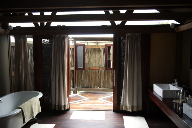 Der Abschied fiel uns am nächsten Tag schwer, aber es wartete ja nun die Safari in Makgadikgadi Pans auf uns. Vorher wurden wir jedoch zur Besichtigung des Jao Camps in der gleichen Konzession gefahren, wo uns der Manager William die villenartigen Zimmer und das preisgekrönte SPA zeigte, was neben der neuen Solaranlage sein ganzer Stolz war.Nicht nur davon, auch vom gesamten Ambiente waren wir schwer beeindruckt, es ist ein absolutes Spitzen-Safaricamp! William lud uns auch noch zu einem frühen Mittagessen ein, das ebenfalls entsprechend fein war, und wir sprachen über die Bücher von Peter Allison, der als Safari- Guide in Botswana gearbeitet und seine Erlebnisse mit den Tieren und Gästen sehr witzig verarbeitet hat. ( “Dont run, whatever you do”) Wie wir hörten, arbeitet er nun für Wilderness Safaris und macht die Qualitätssicherung der Camps. Wenig später, Sylvia suchte gerade die Toilette, kam ein Mann in Shorts an unseren Tisch, stellte sich mir als „Peter“ vor, und verschwand nach kurzem Gespräch über eine Mokoro-Tour mit den Gästen wieder. William und ich wechselten einen vielsagenden Blick , ich ahnte es schon, „that was him“ bemerkte er nur.